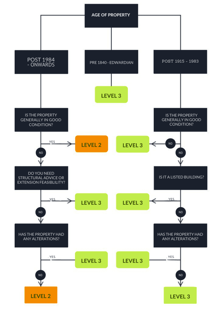 When considering a property, homebuyers are frequently puzzled about the appropriate survey to choose. Thus, this guide has been created to assist in clarifying the distinctions between different surveys. Additionally, assistance is provided by a convenient flow chart found below.